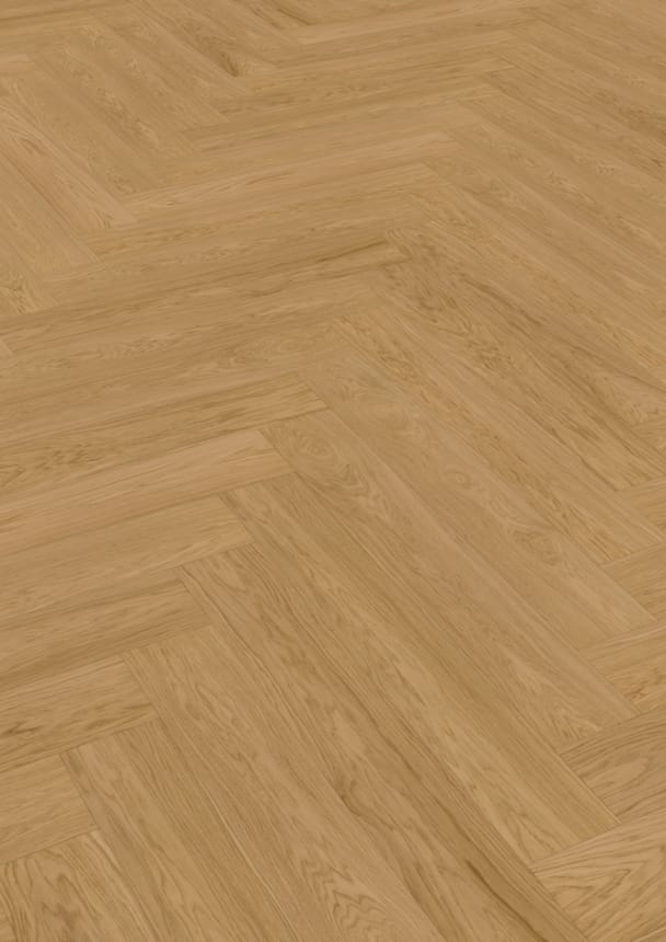 Le sol à bâtons rompus chêne capitol reef Hywood de la collection Herringbone de ter Hürne mesure 774 mm de long, 129 mm de large et 11 mm d’épaisseur..
